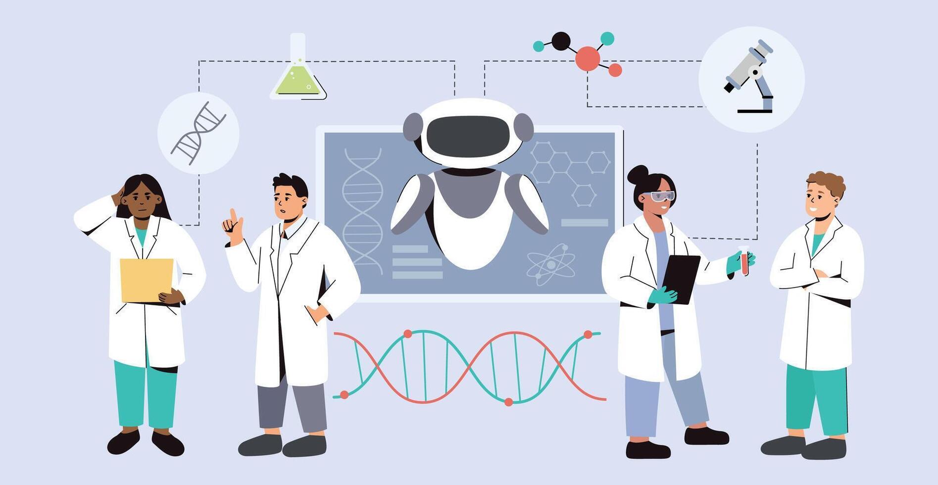 Flat team of scientists using AI in medicine. Artificial intelligence in medical science research. Futuristic tech in healthcare. Doctors using innovative technologies in lab for diagnosis, treatment. Pro Vector