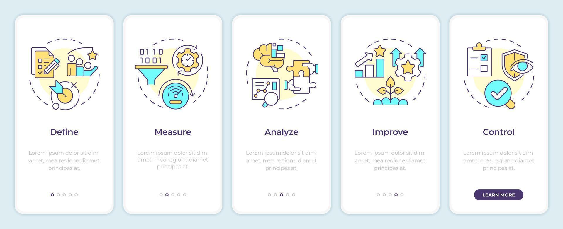 Six sigma methodology onboarding mobile app screen. Walkthrough 5 steps editable graphic instructions with linear concepts. UI, UX, GUI template. Montserrat SemiBold, Regular fonts used Pro Vector