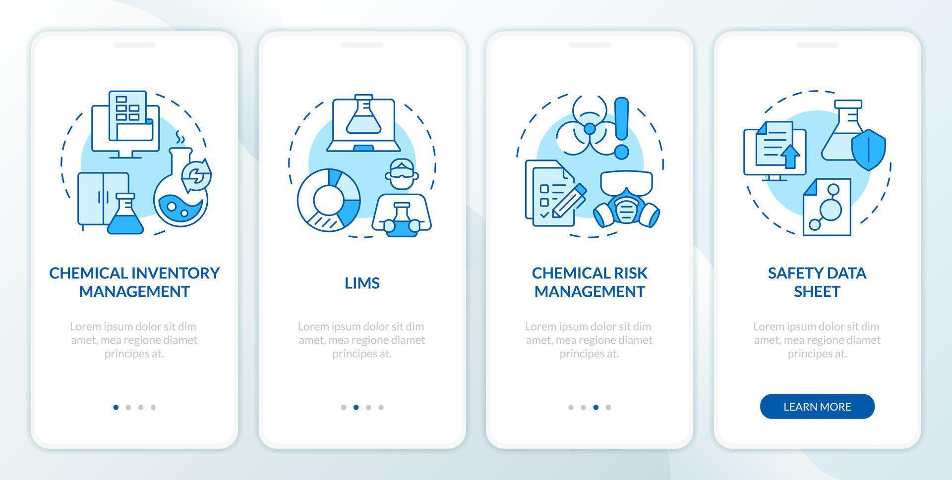 Science risk management blue onboarding mobile app screen. Walkthrough 4 steps editable graphic instructions with linear concepts. UI, UX, GUI template Pro Vector