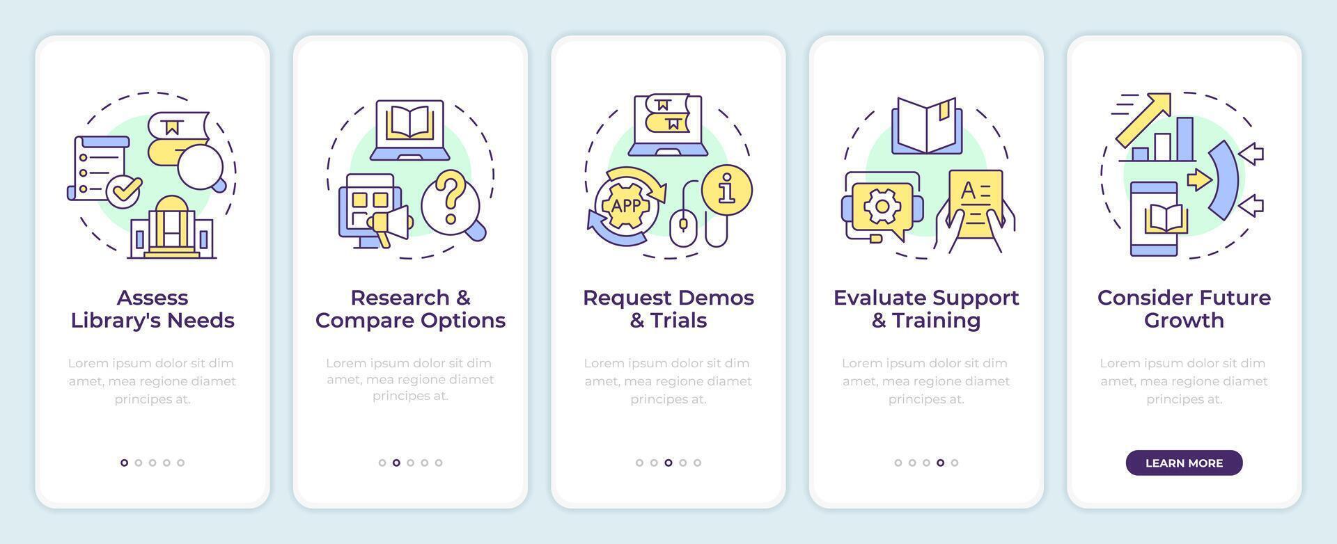 Library systems onboarding mobile app screen. Digital advancement. Walkthrough 5 steps editable graphic instructions with linear concepts. UI, UX, GUI template. Montserrat Semibold, Regular fonts used Pro Vector