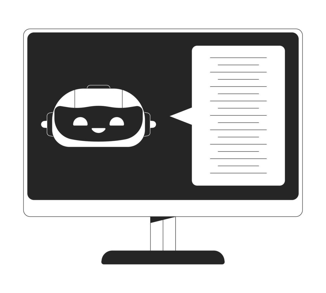 Chatbot AI computer display black and white 2D line cartoon object. Artificial intelligence messenger bot isolated outline item. Voice to text software monochromatic flat spot illustration Pro Vector