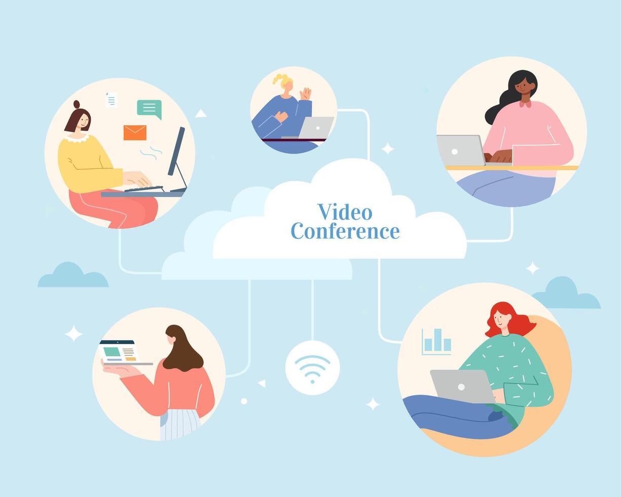 People from different places using laptops to access cloud database . Flat illustration, concept of cloud computing and remote access. Pro Vector