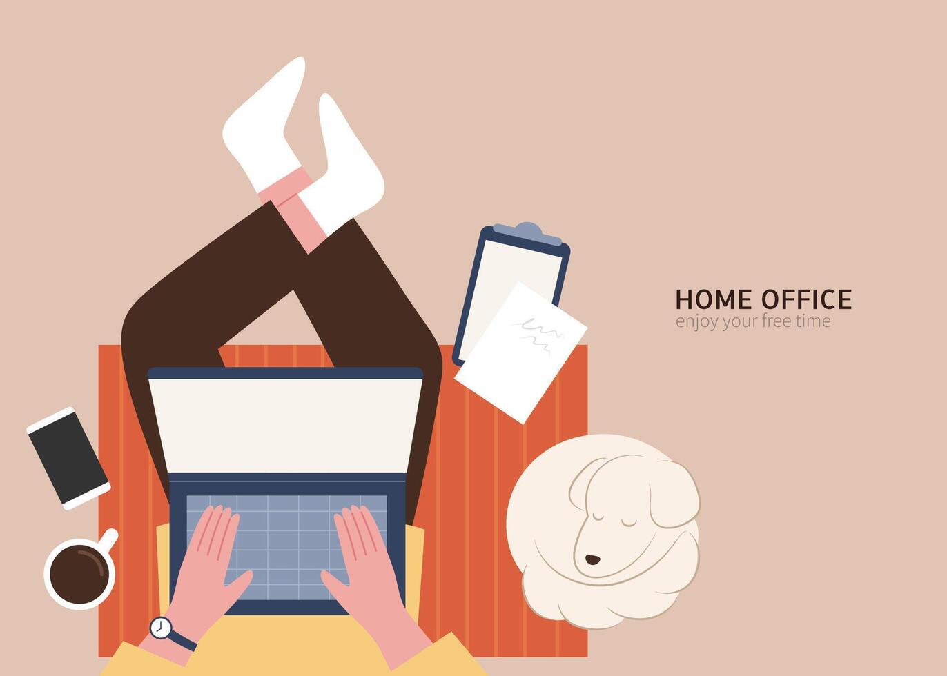 Man point of view, working on laptop with dog resting by. Home office concept flat illustration design. Pro Vector
