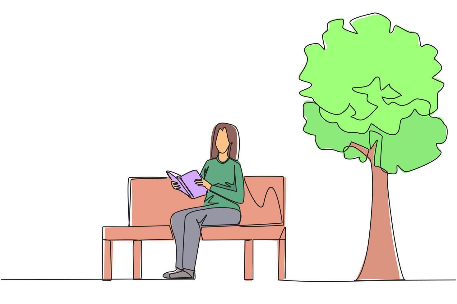 Single one line drawing woman sitting on park bench reading the book. Learn by re-reading the textbook. Read to get maximum marks. Reading increase insight. Continuous line design graphic illustration Pro Vector
