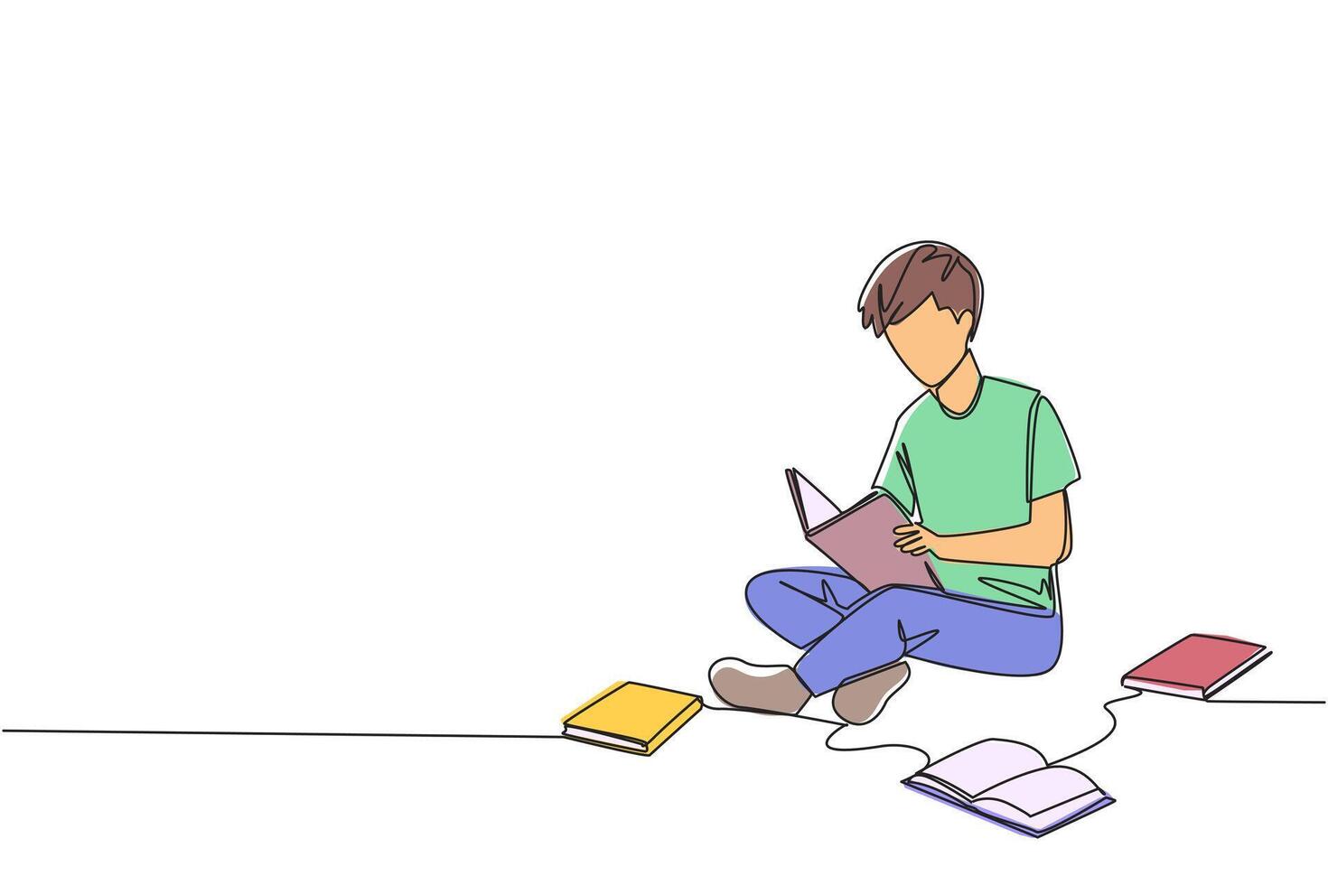Single continuous line drawing man sitting relaxed in a library reading a lot of books. Looking for answers to assignments. Hobby reading. Book festival concept. One line design illustration Pro Vector