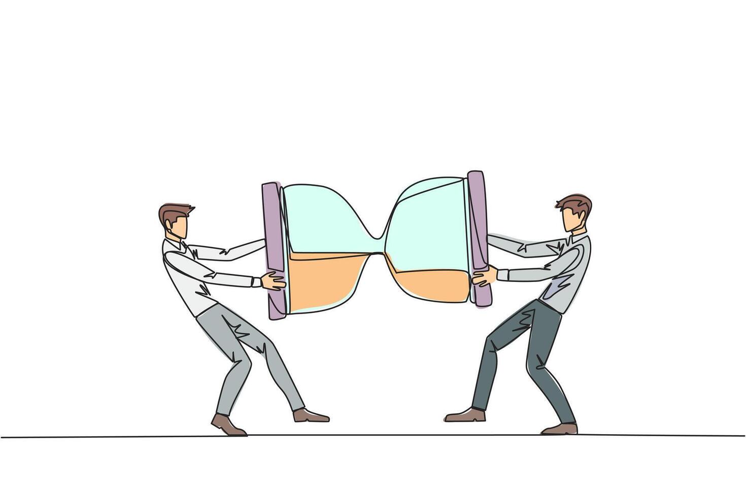 Continuous one line drawing two angry businessman fighting over the hourglass. Ask each other for additional time to send the company profile. Aggressive. Single line draw design illustration Pro Vector
