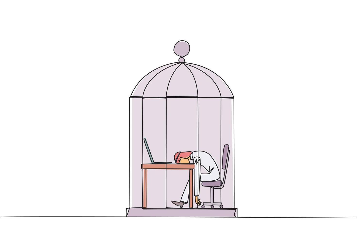 Single one line drawing Arabian businessman trapped in cage asleep on laptop. Tired of repetitive routines. The many deadlines require overtime every day. Continuous line design graphic illustration Pro Vector