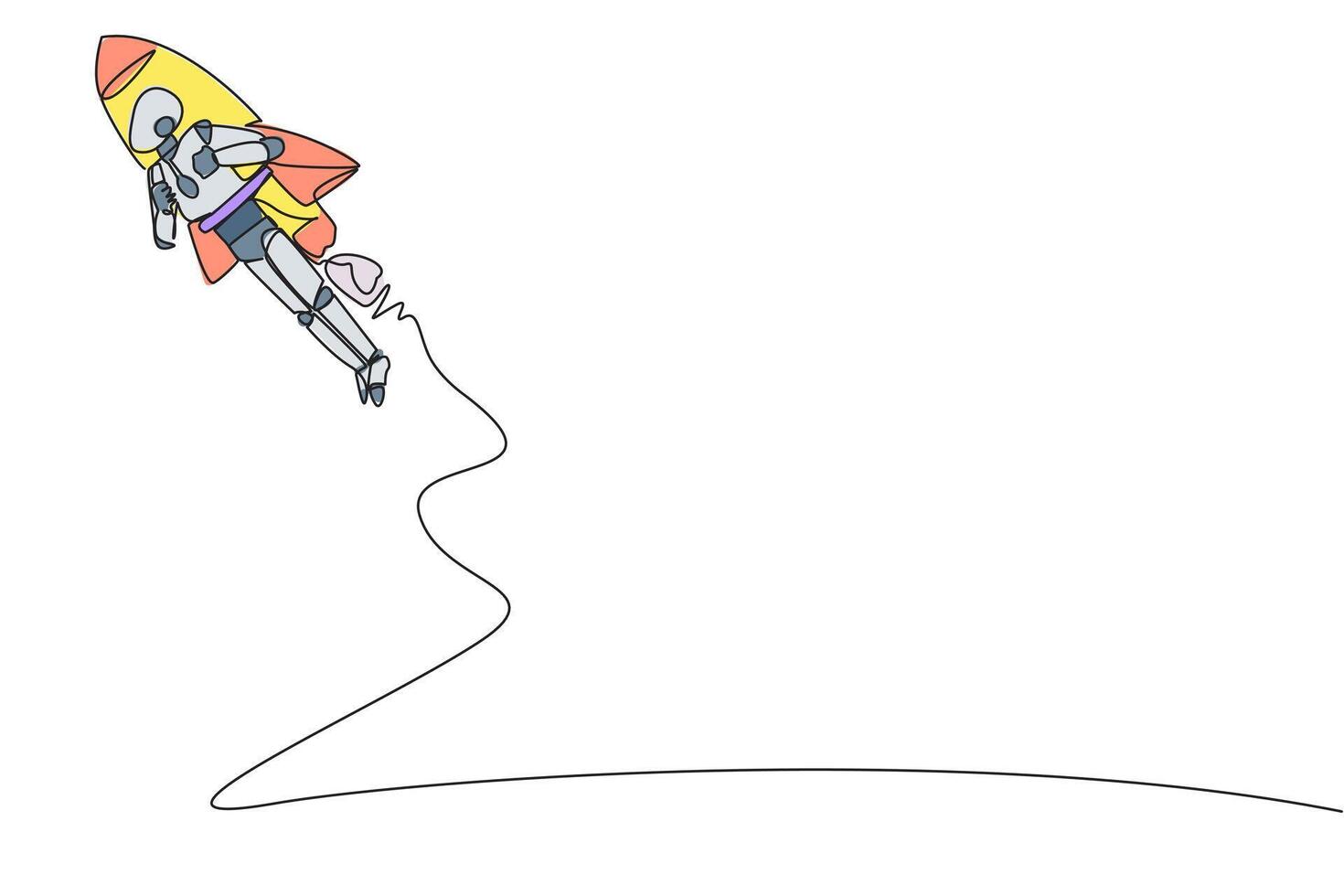 Single one line drawing smart robot flying with rocket. Desire to take the business to the moon. Successful entrepreneur. The great smartest robot. AI tech. Continuous line design graphic illustration Pro Vector