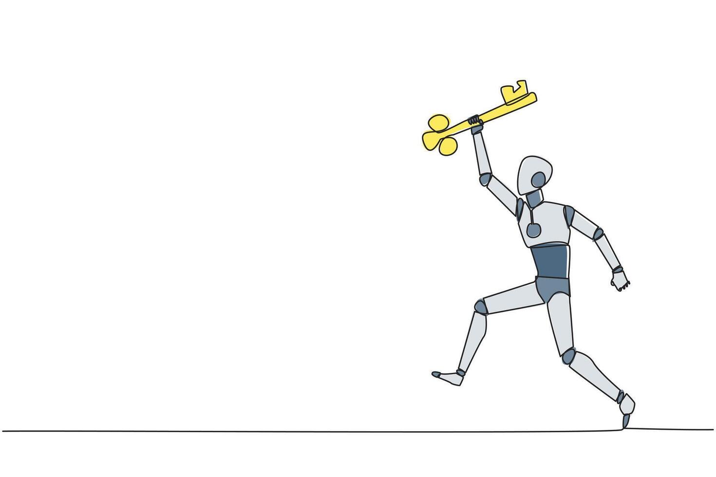 Single one line drawing smart robotic running holding key. Doing celebrate. Perform movements like a relay athlete. The secret key to business revival. Continuous line design graphic illustration Pro Vector