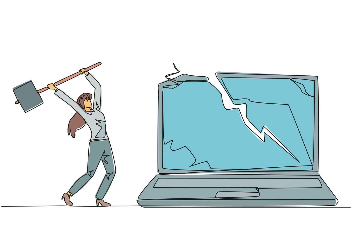Single one line drawing businesswoman preparing to hit laptop. Rampage. Destroying technology that cannot be used optimally. Upgrade hardware and brainware. Continuous line design graphic illustration Pro Vector