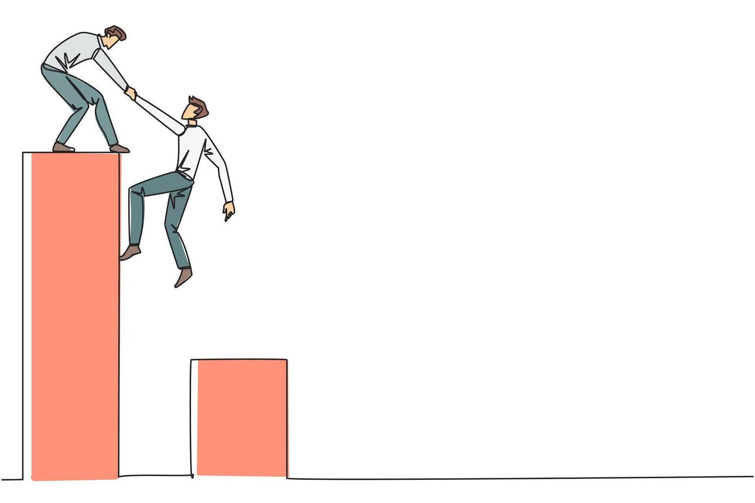 Continuous one line drawing businessman helps colleague climb bar graph. Helping to climb to higher ground. Move forward and success together. Teamwork. Single line draw design illustration Pro Vector