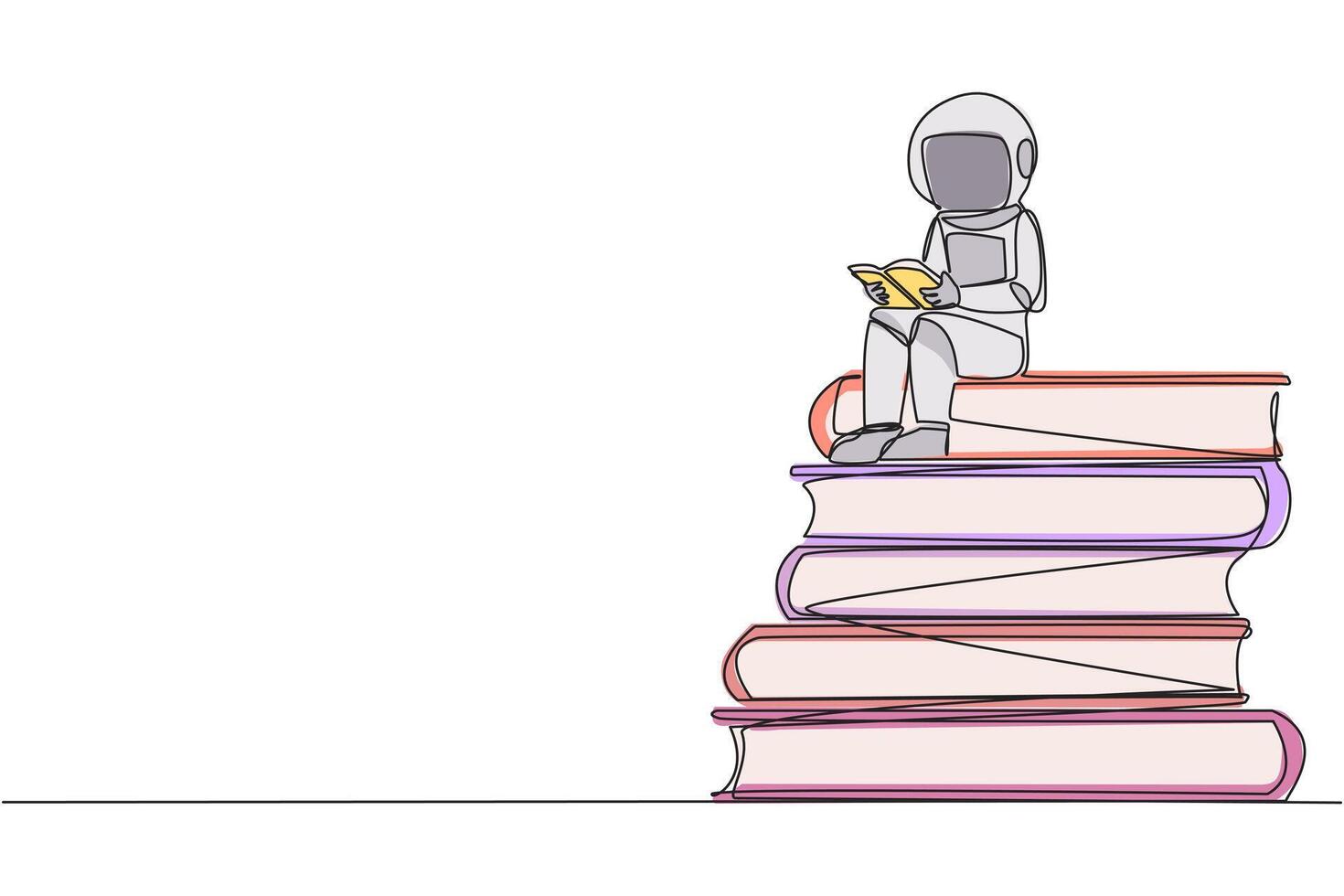 Single one line drawing astronaut sitting on pile of books reading book. High interest in reading. Opening horizon of thinking. Space book festival concept. Continuous line design graphic illustration Pro Vector