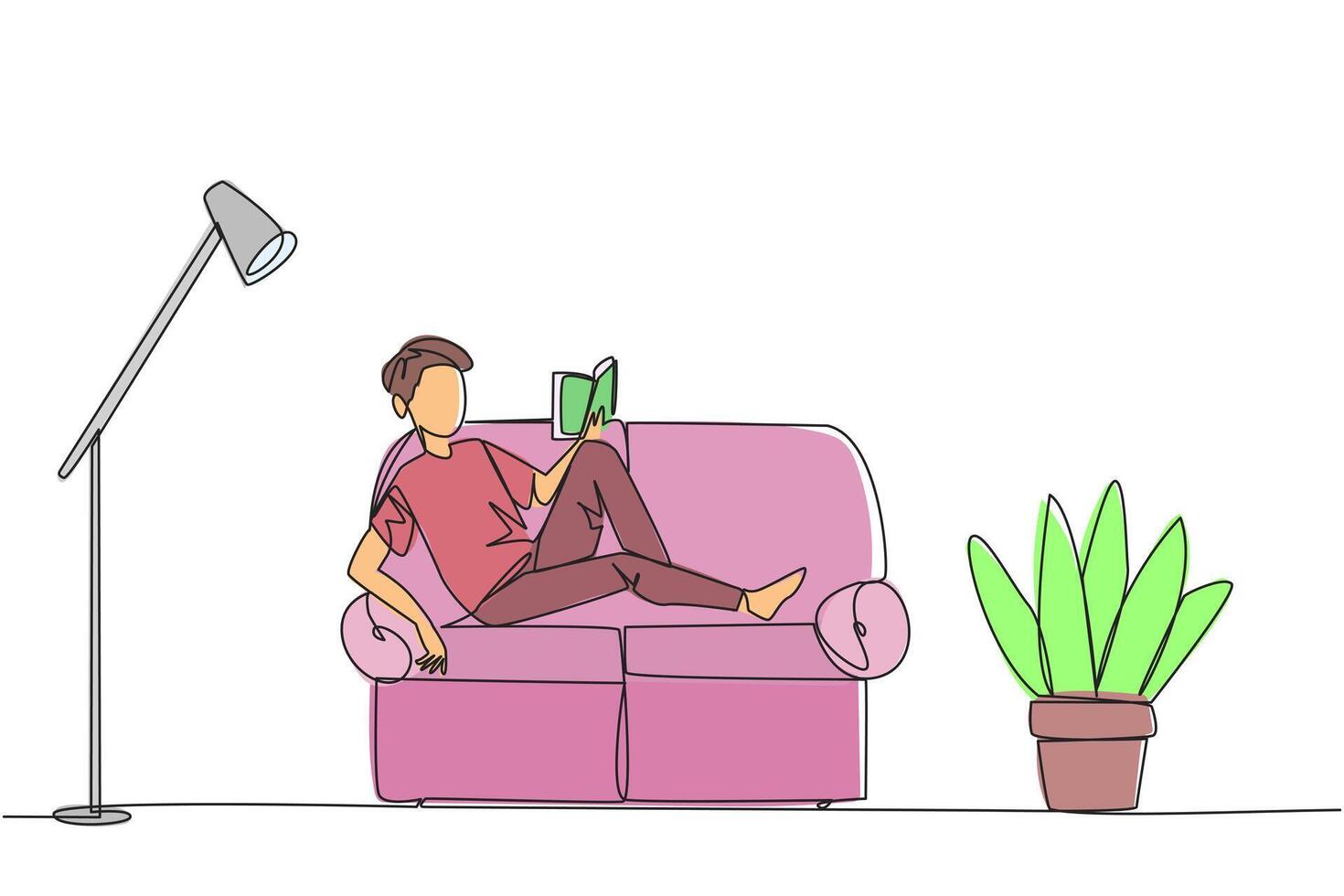 Single continuous line drawing man sitting stretched out on the sofa reading book. Really like the content of the book reading on each page. Impressive. Love read. One line design illustration Pro Vector