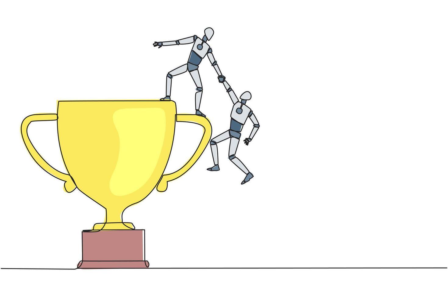Single one line drawing smart robotic helps colleague climb the big trophy. Achievement that cannot be achieved without great teamwork. Smart teamwork. Continuous line design graphic illustration Pro Vector