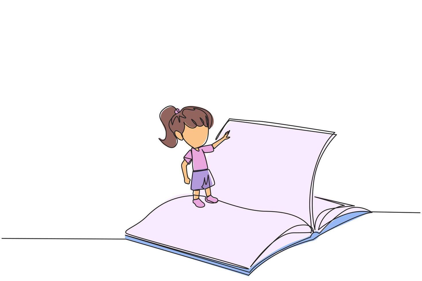 Single one line drawing girl standing over open ledger turning the pages. Read slowly to understand the contents of each page. Reading increases insight. Continuous line design graphic illustration Pro Vector