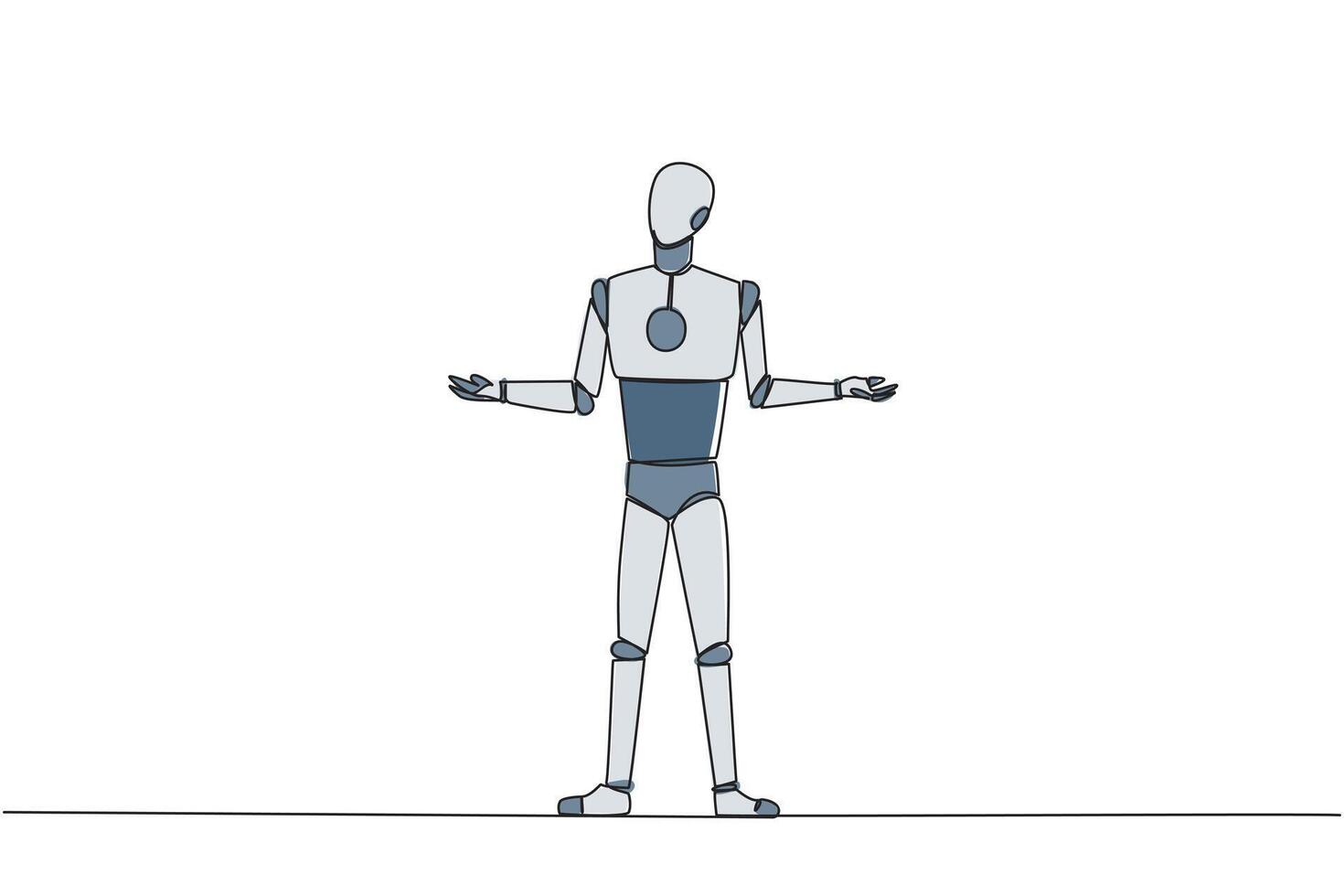 Continuous one line drawing smart robot standing straight with open arms. Lonely and sadness robot lamenting undeveloped business. Unhappy manager. AI tech. Single line draw design illustration Pro Vector