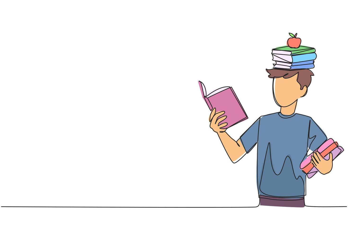 Single one line drawing man reading book practicing balance. Stack books on top of head along with the apple. Balancing reading rhythm, train focus. Read. Continuous line design graphic illustration Pro Vector