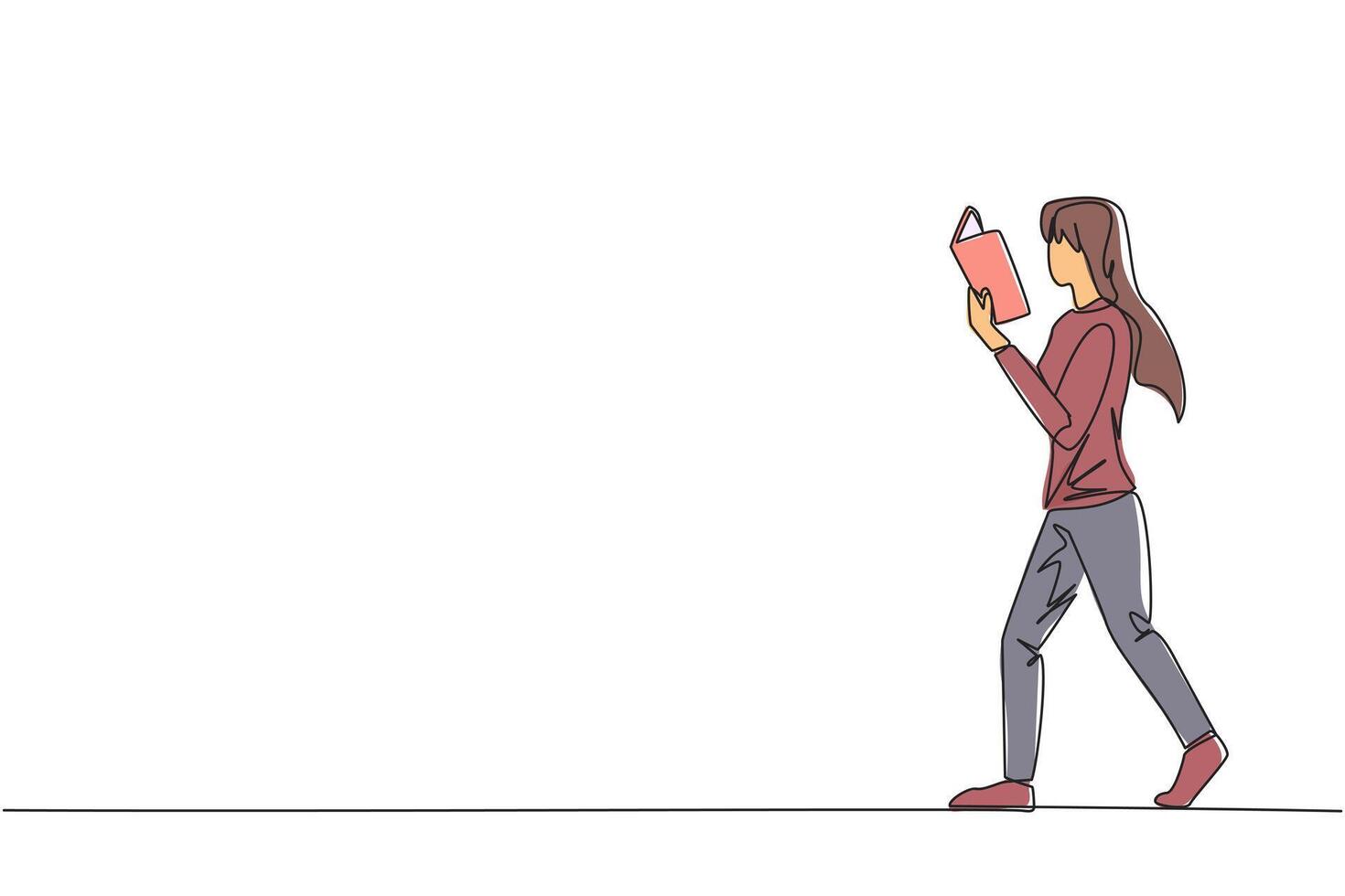 Single continuous line drawing woman walking while reading book. The gesture of memorizing something from a book. Read anywhere. Addicted to reading. Book festival. One line design illustration Pro Vector