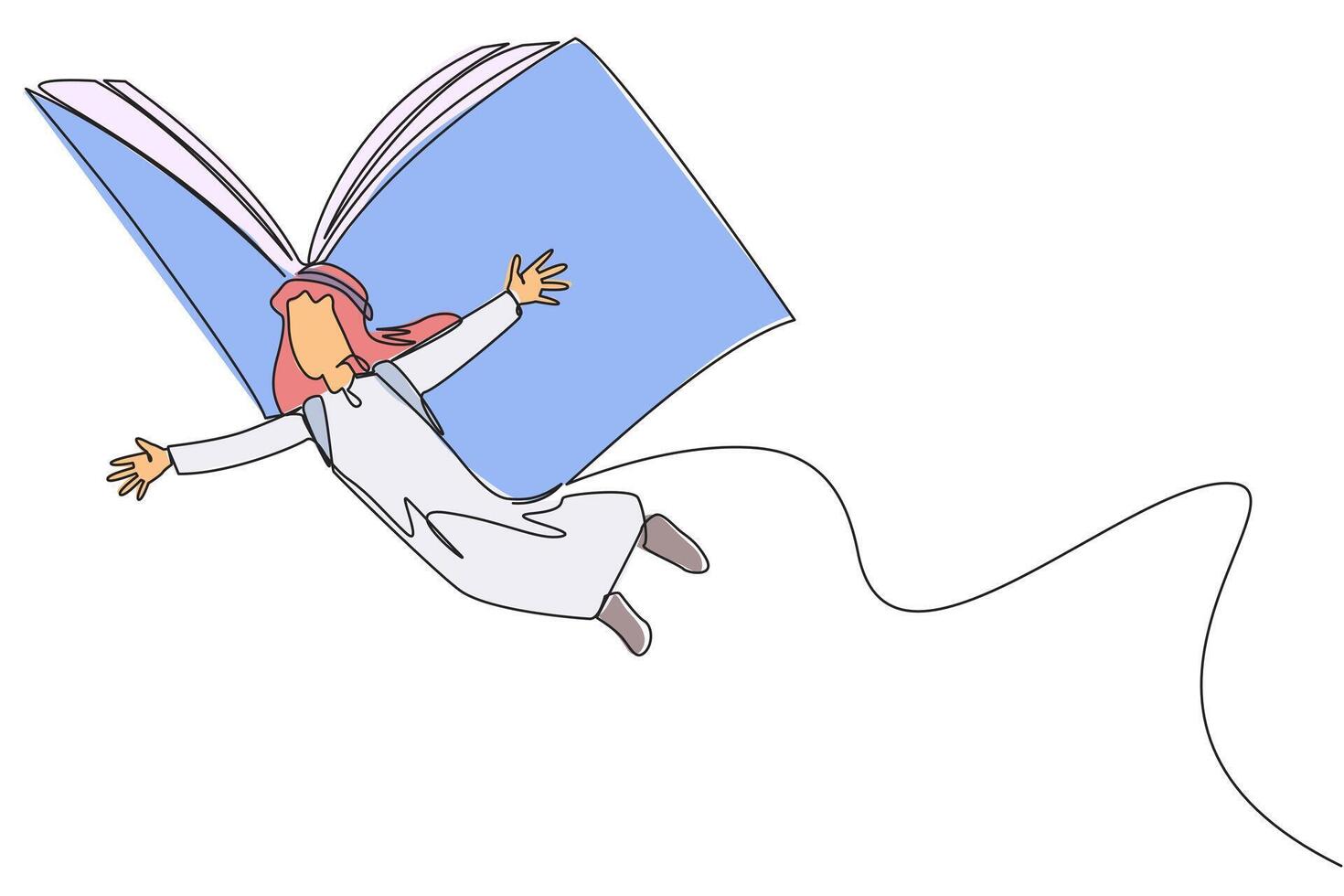Single one line drawing Arabian man flying with wings that come from an open big book. The metaphor carried away with the storyline. Constructive fantasy. Continuous line design graphic illustration Pro Vector