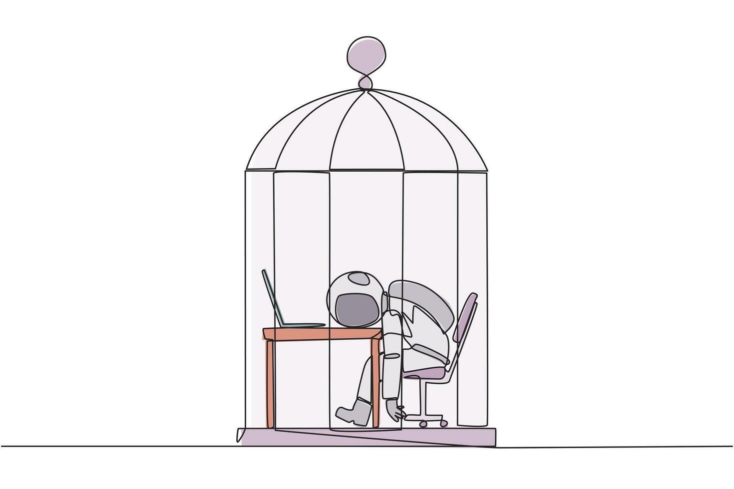 Continuous one line drawing astronaut trapped in the cage asleep on laptop. Tired of repetitive routines. The many deadlines require overtime every day. Single line draw design illustration Pro Vector