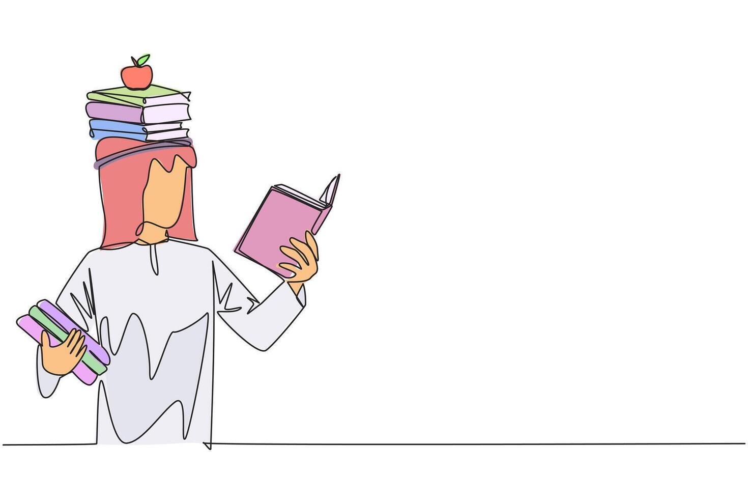 Single continuous line drawing Arabian man reading book practicing balance. Stack books on top of head along with the apple. Balancing reading rhythm, train focus. One line design illustration Pro Vector