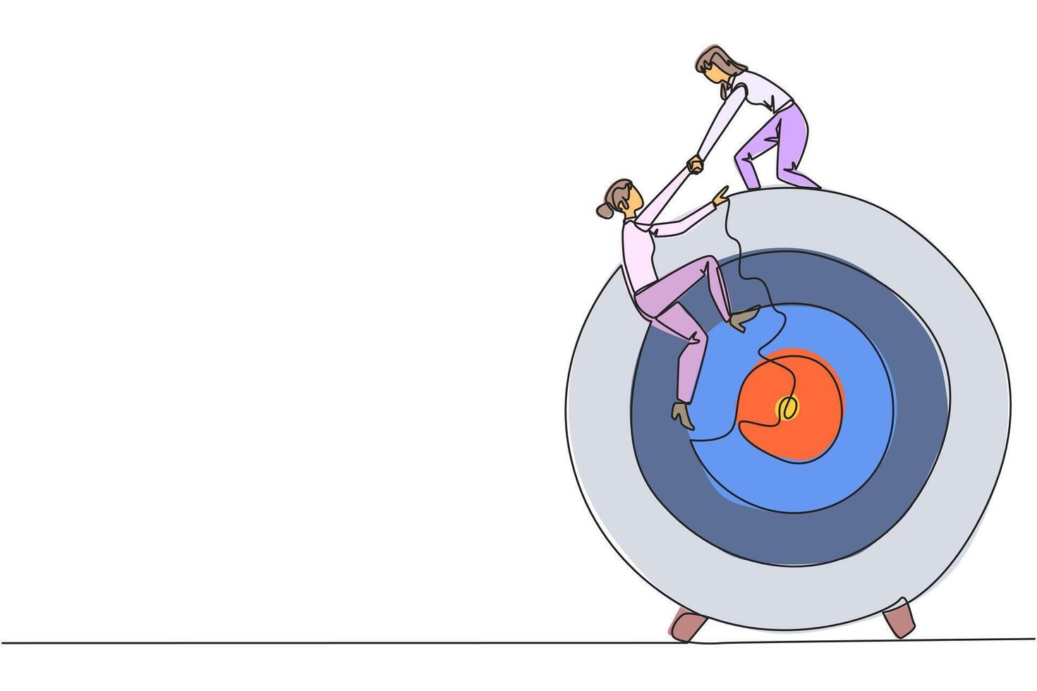 Single one line drawing businesswoman helps colleague climb arrow board target. Metaphors help focus on completing tasks one at time. Success together. Continuous line design graphic illustration Pro Vector