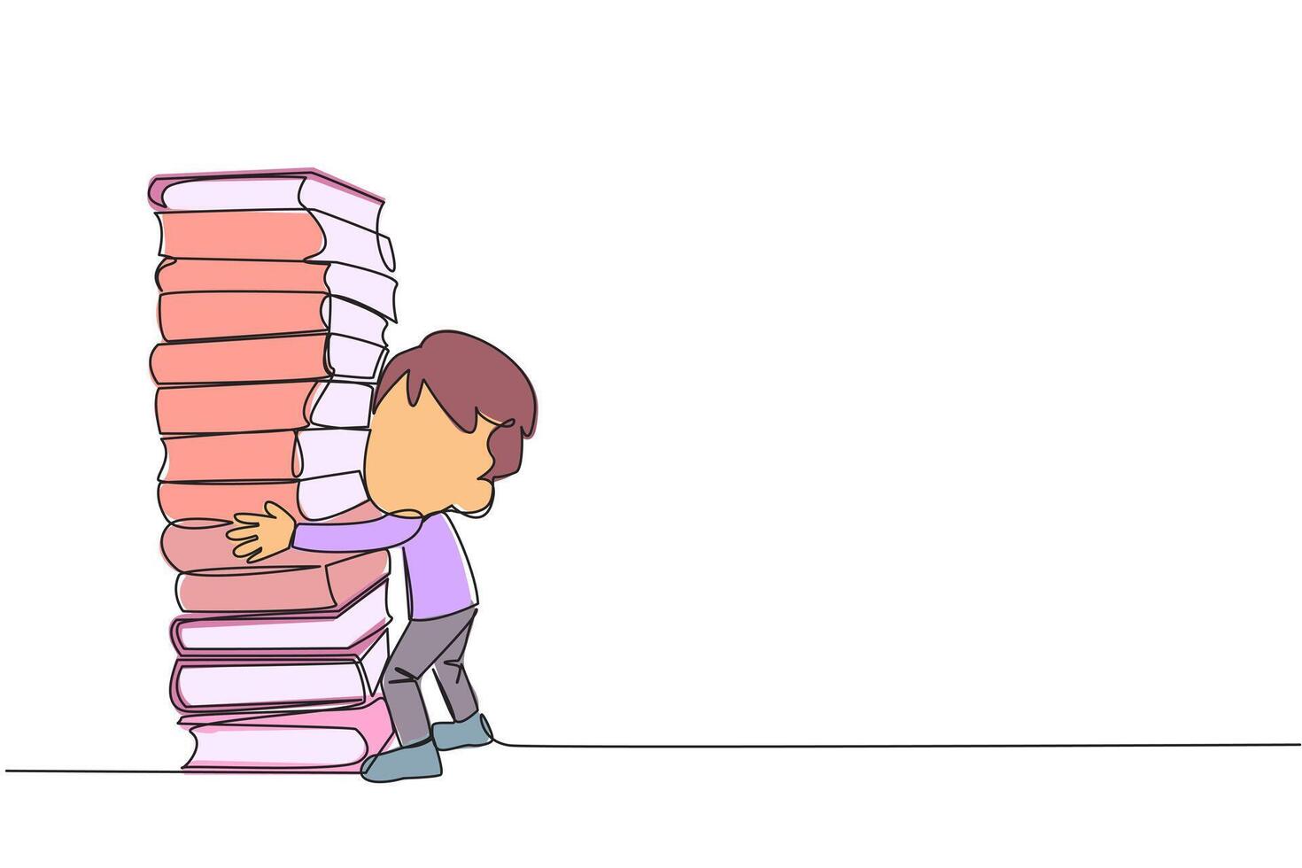 Continuous one line drawing boy hugging a very high pile of books. Hobby to collecting and reading books. Filling free time with useful things. Loving read. Single line draw design illustration Pro Vector