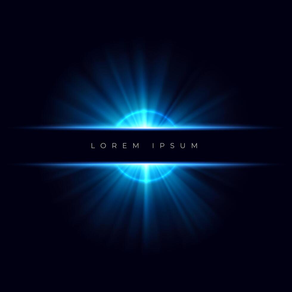 template with light blue flash and copy space. Illustration with realistic explosion, bright rays on dark background. Lens effect. Space wallpaper with place for text. Pro Vector