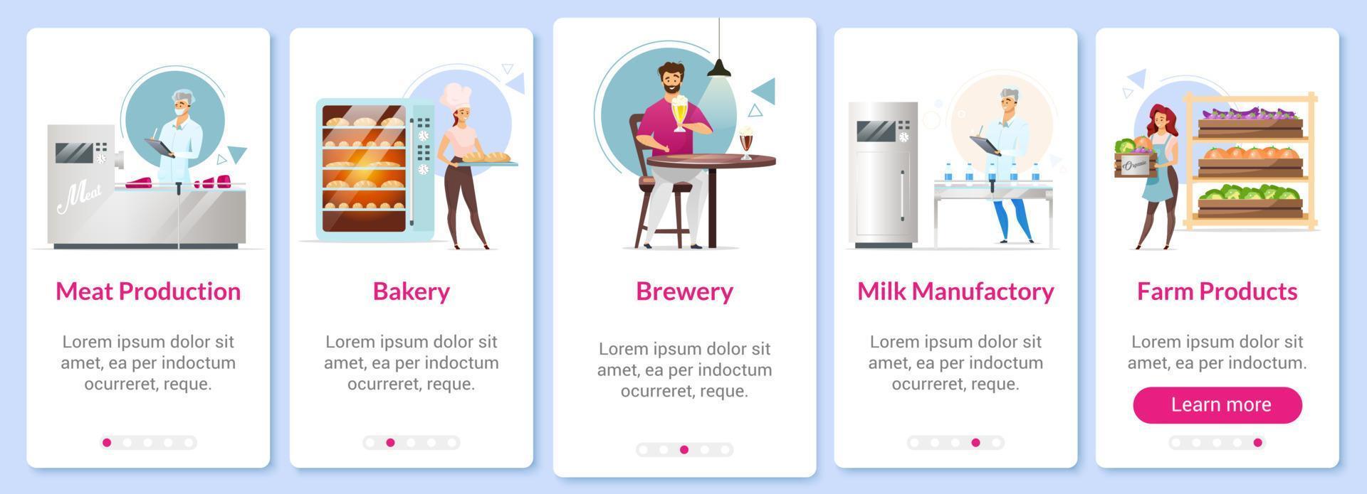 Production onboarding mobile app screen vector template. Meat, milk and farm products. Bakery. Brewery. Walkthrough website steps with flat characters. UX, UI, GUI smartphone cartoon interface concept Pro Vector