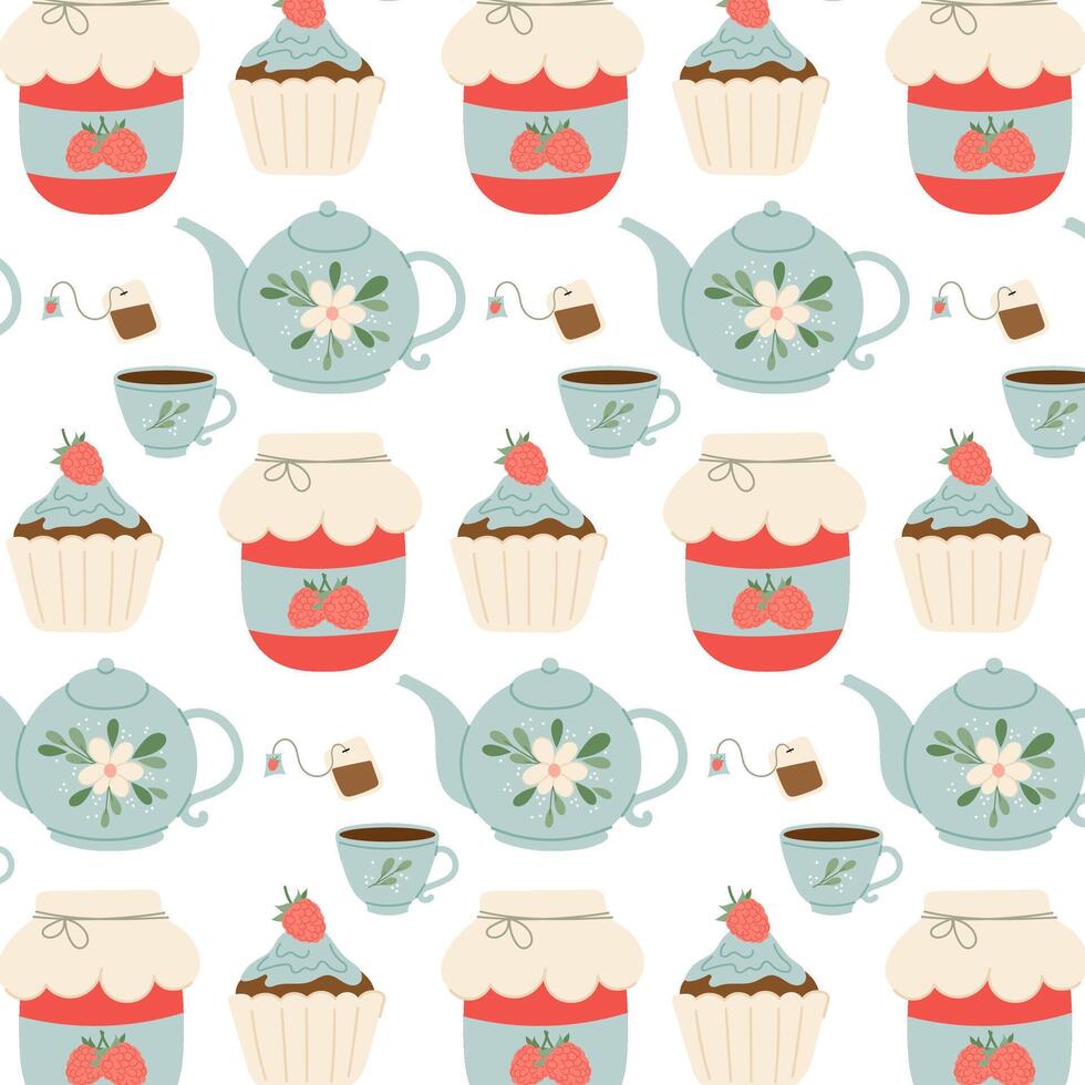 Tea party. Breakfast. Pattern with teapot, cupcake and jam in flat style. Pattern for textile, wrapping paper, background. Pro Vector
