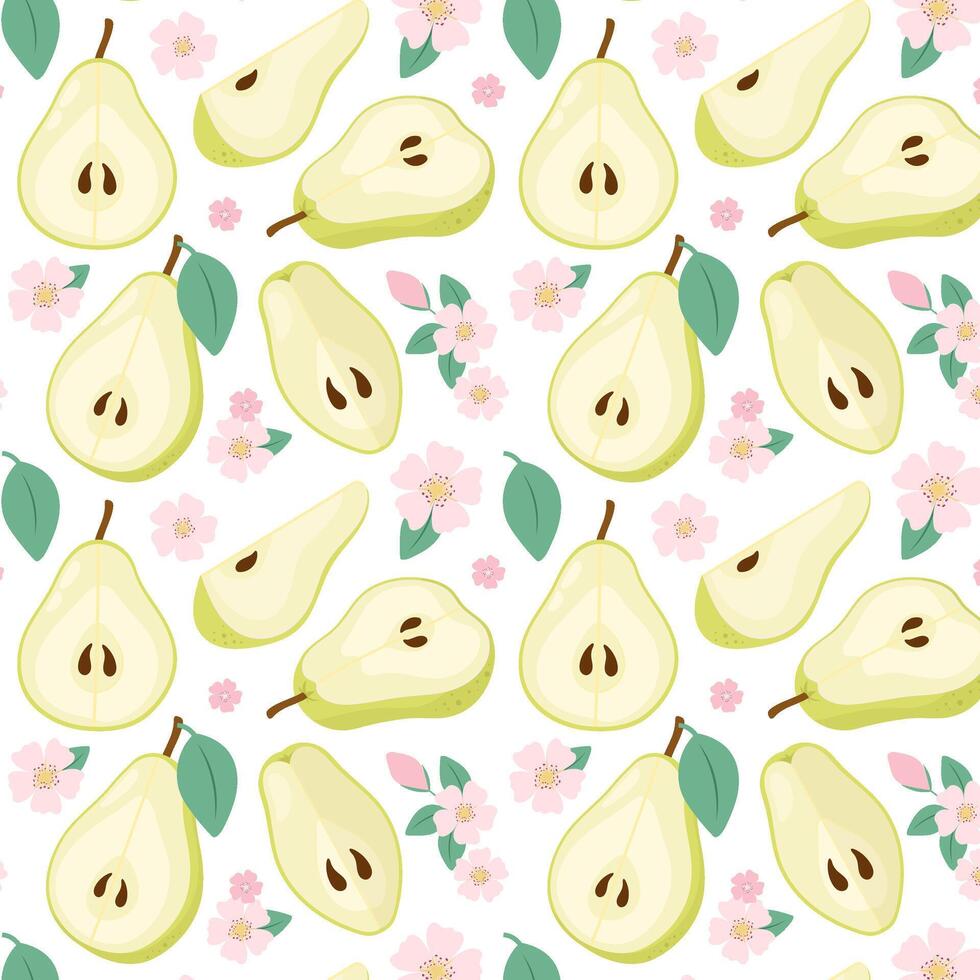 Green pear slices in flat style. Halves of pear with flowers. Pattern with ripe pear. Pattern for textile, wrapping paper, background. Pro Vector
