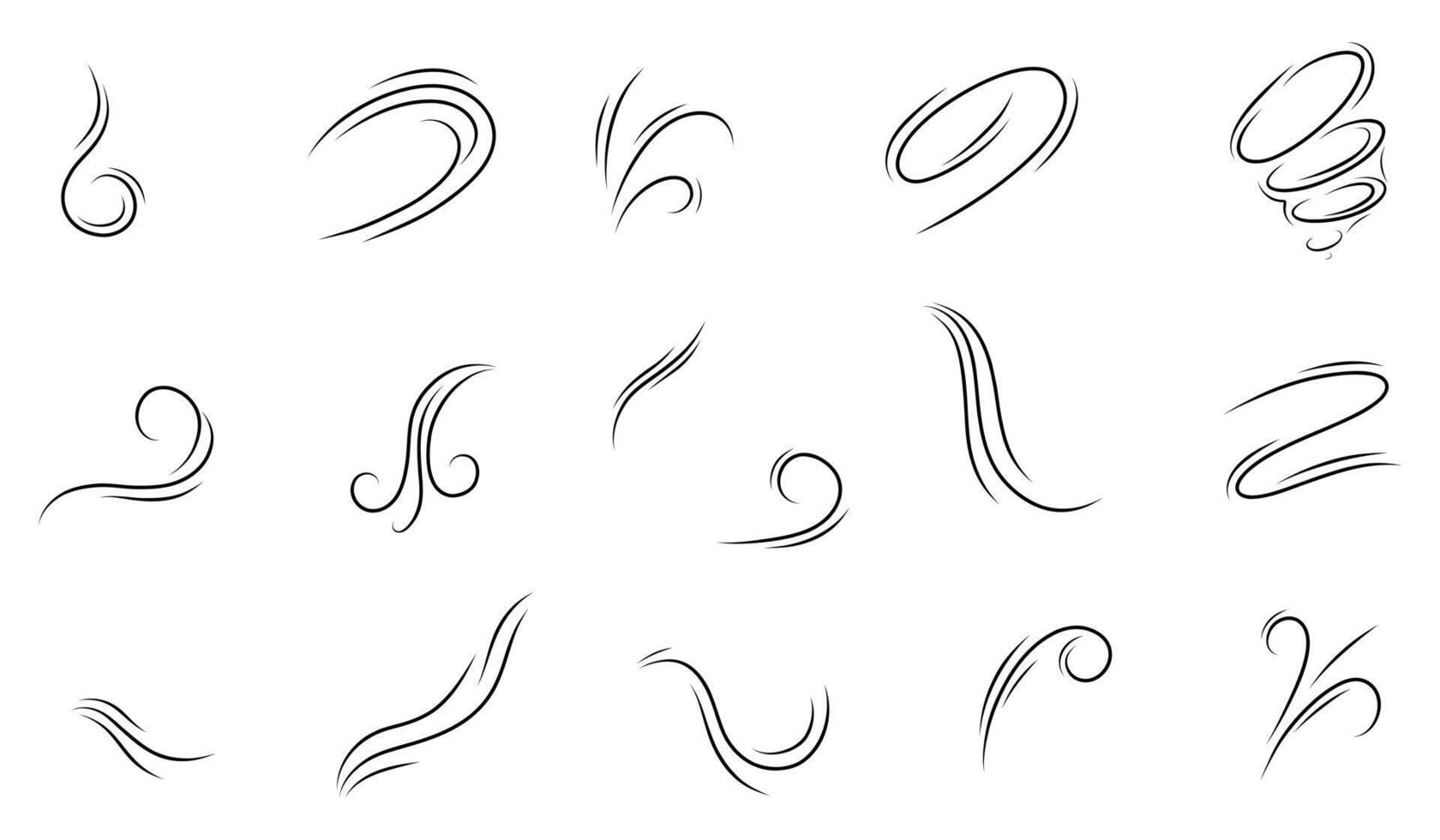 Set of wind blow set in doodle style, illustration on white background. A wave of cold air during windy weather. Rush symbol outline for print and design. graphics, air dynamics Pro Vector