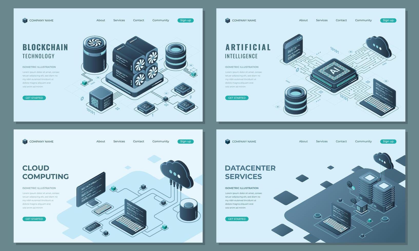 Set of isometric landing page template. Modern technology concept for datacenter with server, artificial intelligence, and blockchain technology Pro Vector