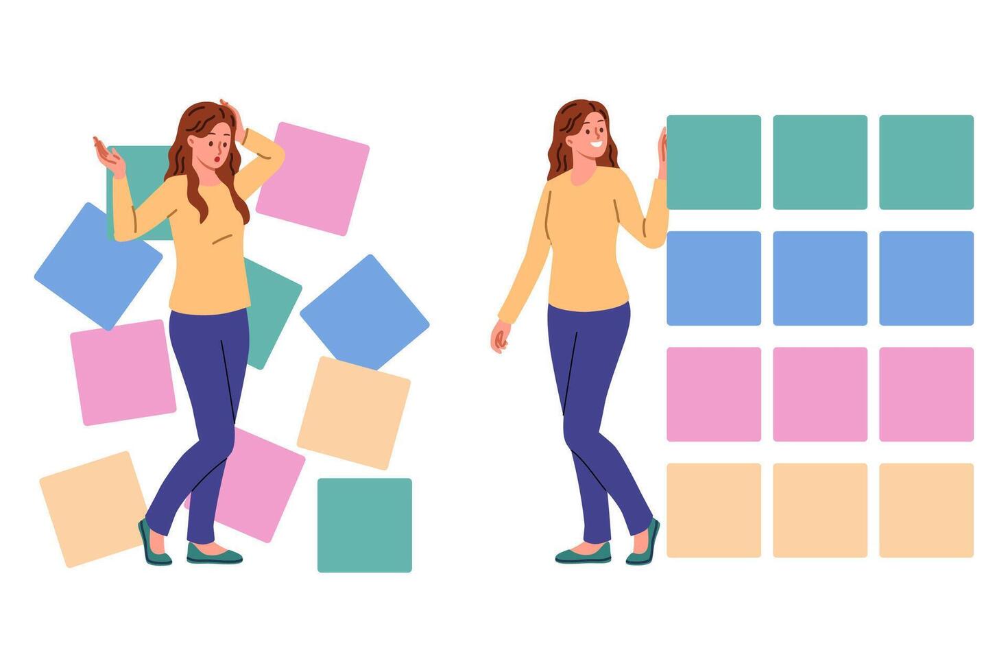 Woman engaged in computer science and business analytics structures chaotically scattered blocks Pro Vector