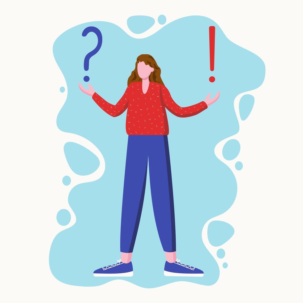 Question and answer. Question and exclamation marks. Young thinking man, girl. Problem and solution concept. Dilemma and understanding. flat illustration. Isolated background. Pro Vector