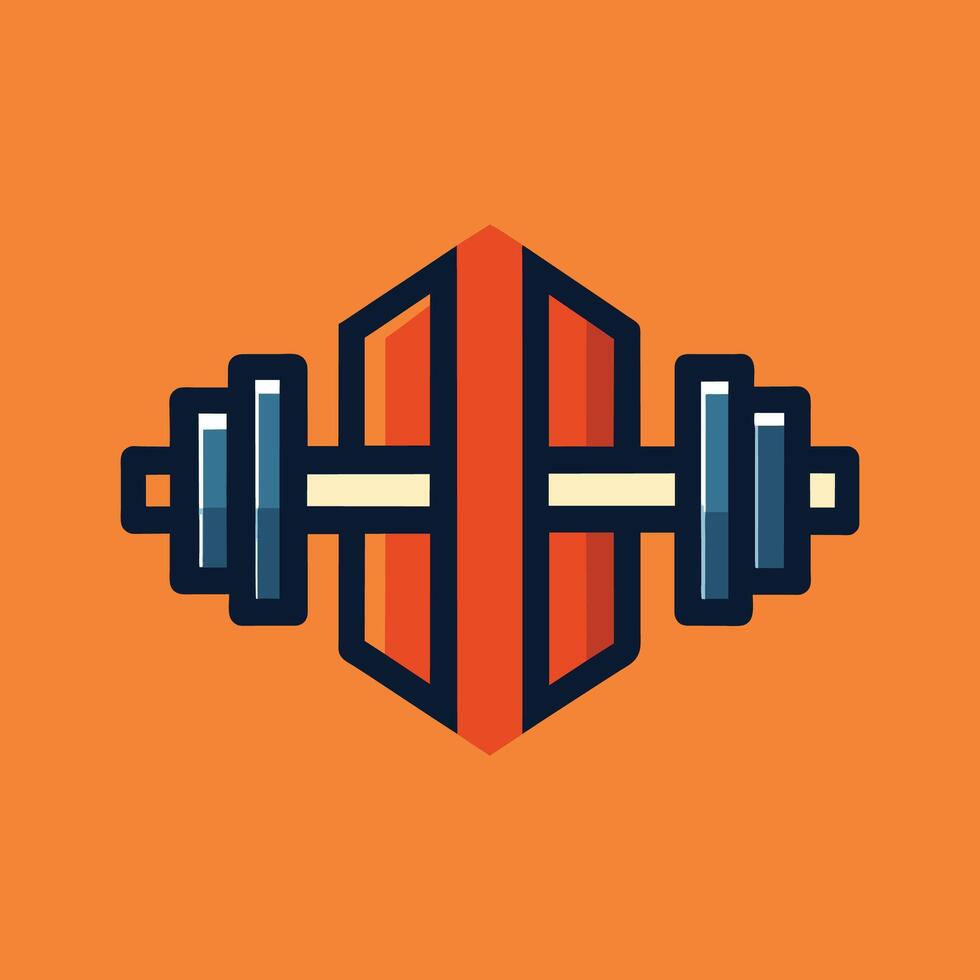 Two dumbbells and a barbell are displayed on a bright orange background, A simple logo of a dumbbell with clean lines and negative space vector