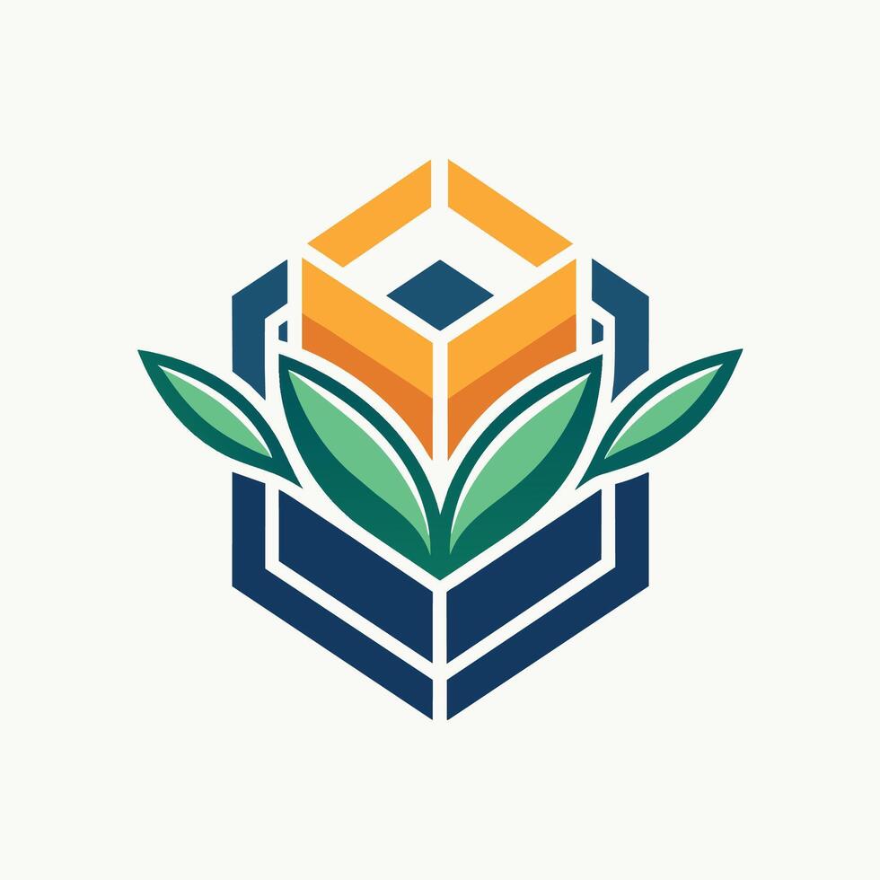 Logo design featuring a cube intertwined with green leaves, symbolizing growth and nature, Abstract geometric shapes representing growth and stability vector