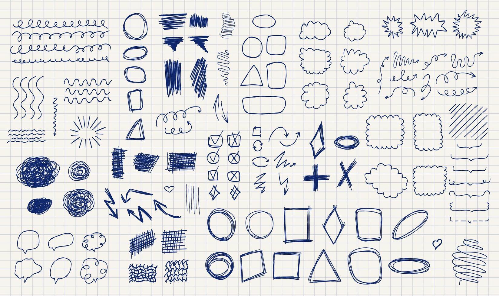A set of hand-drawn sketches. Lines, arrows shapes, scribbles, frames and strokes. A piece of lined paper, shown a creative, abstract designs. Notebook page pen and markers doodles. Pro Vector