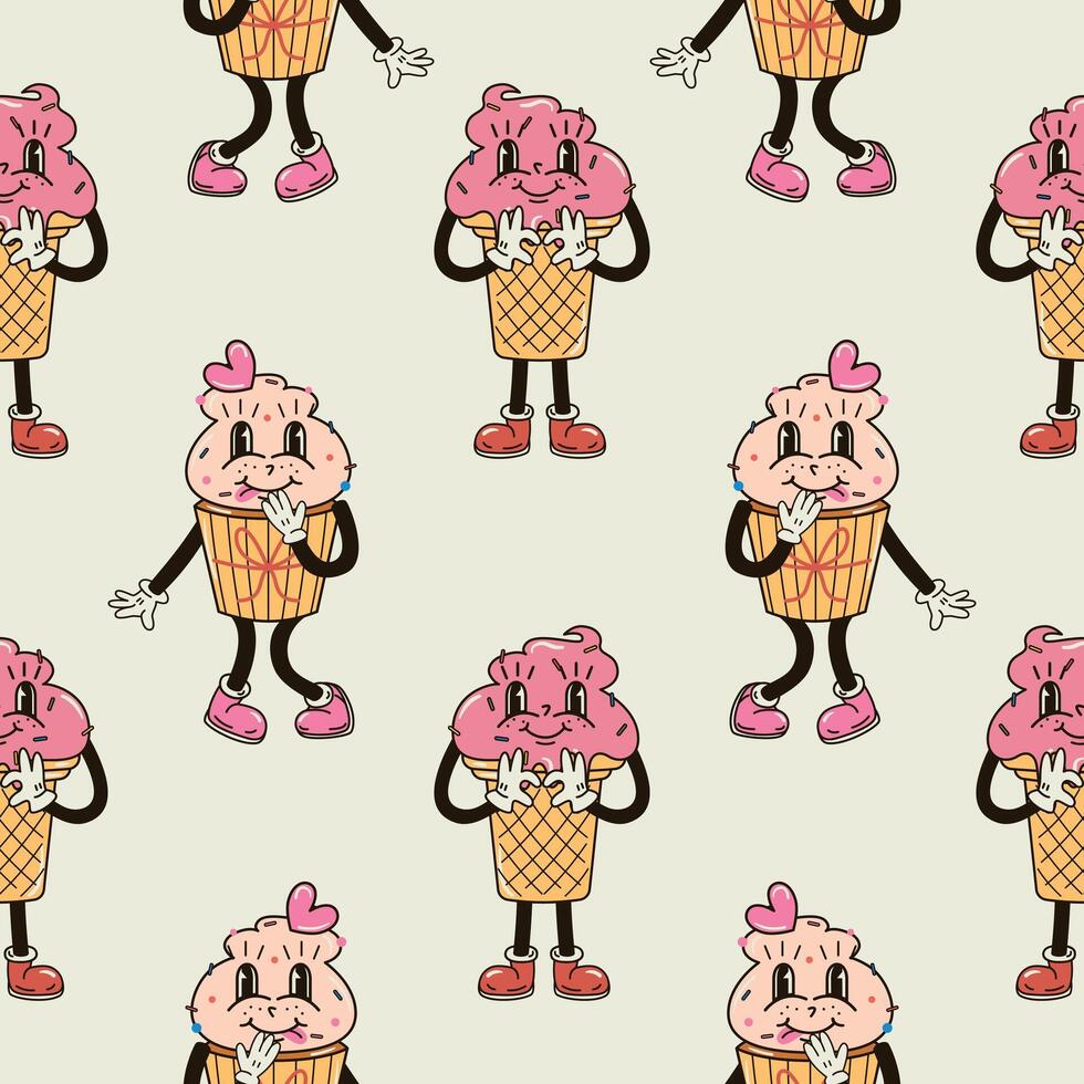 A seamless pattern with a funny and cute ice cream and cupcake character in a groovy style Pro Vector