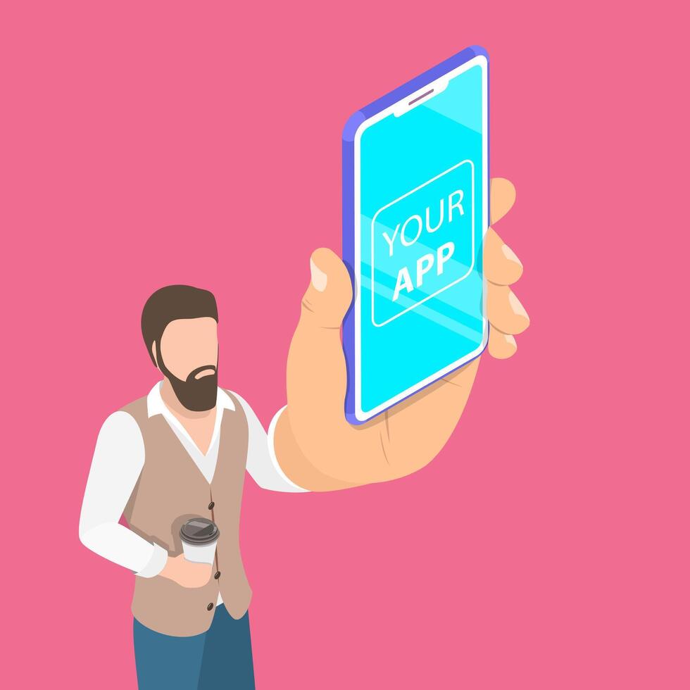 Flat isometric concept of mobile app launch, startup idea. Pro Vector