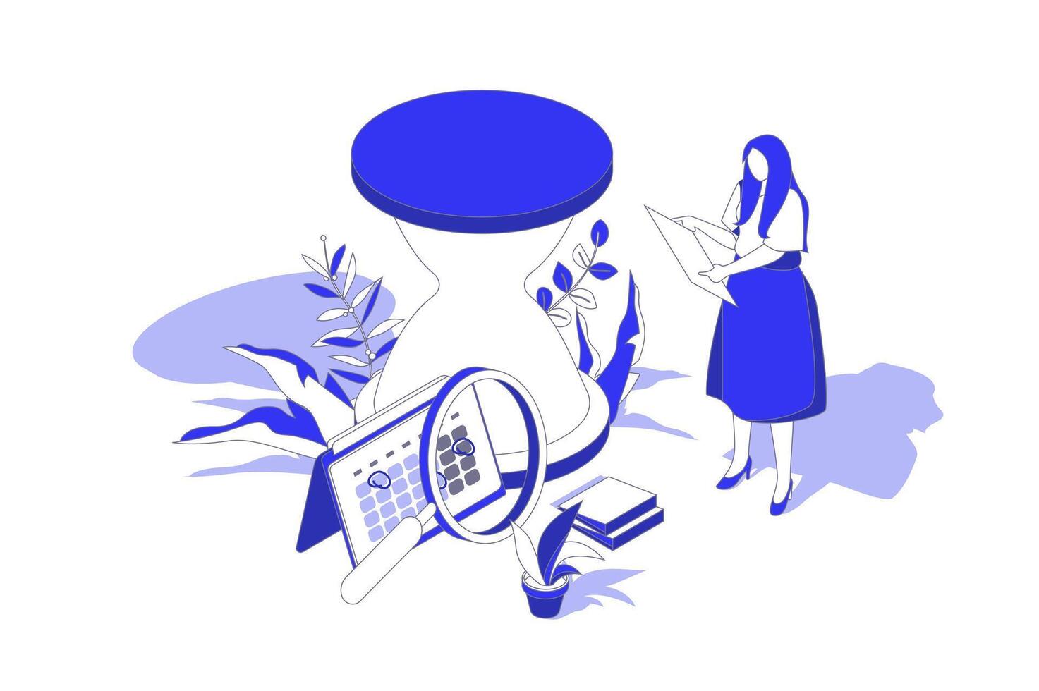 Time management 3d isometric concept in isometry graphic design for web. People scene with woman planning tasks with deadline, improving efficiency and workflow productivity. illustration. Pro Vector