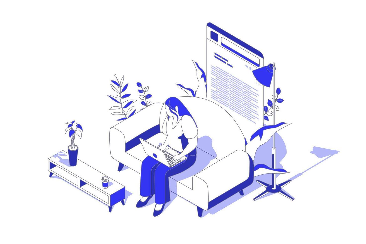 Online reading 3d isometric concept in isometry graphic design for web. People scene with woman reading e-books or digital information using laptop, learning with textbook app. illustration. Pro Vector
