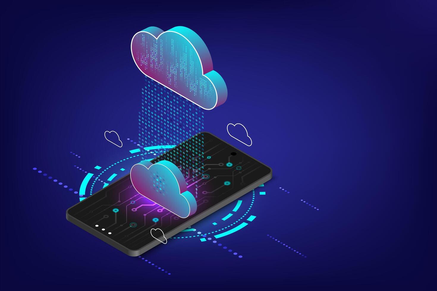 Hi-tech abstract background of cloud computing concept. Technology Connecting to cloud computing, downloading and uploading data on mobile portable device. Abstract 3d isometric illustration Pro Vector