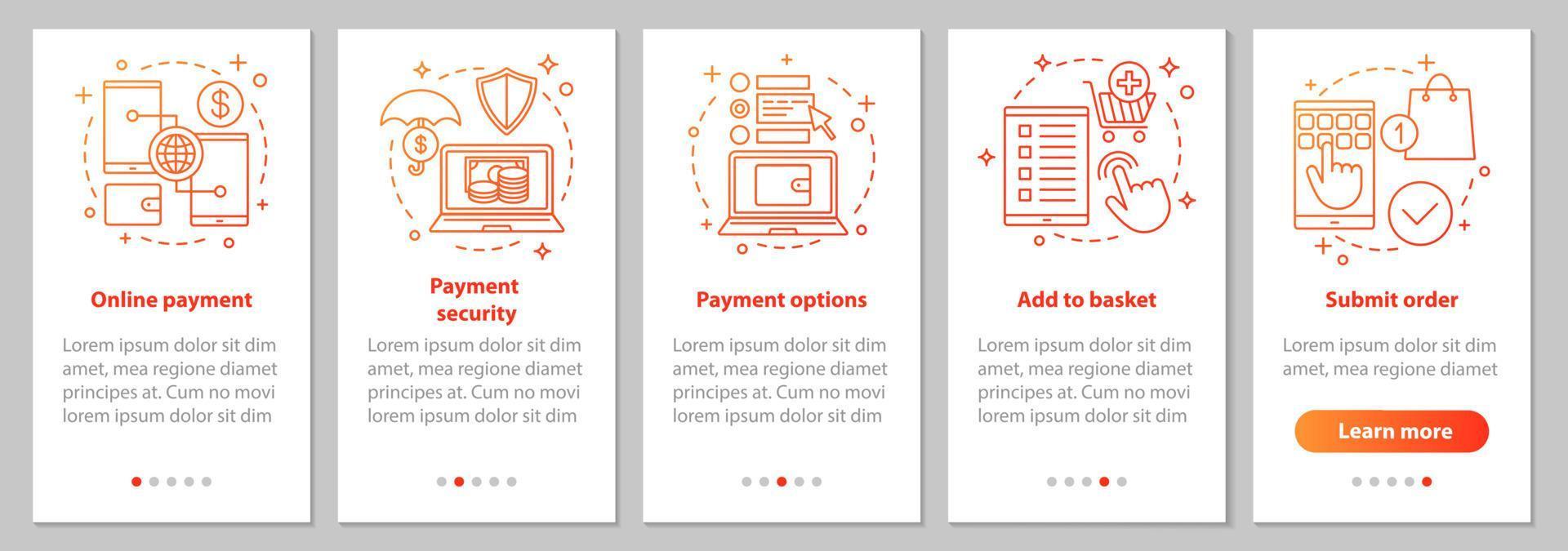 Online shopping onboarding mobile app page screen with linear concepts. Digital purchase. E-payment. Steps graphic instructions. UX, UI, GUI vector template with illustrations Pro Vector