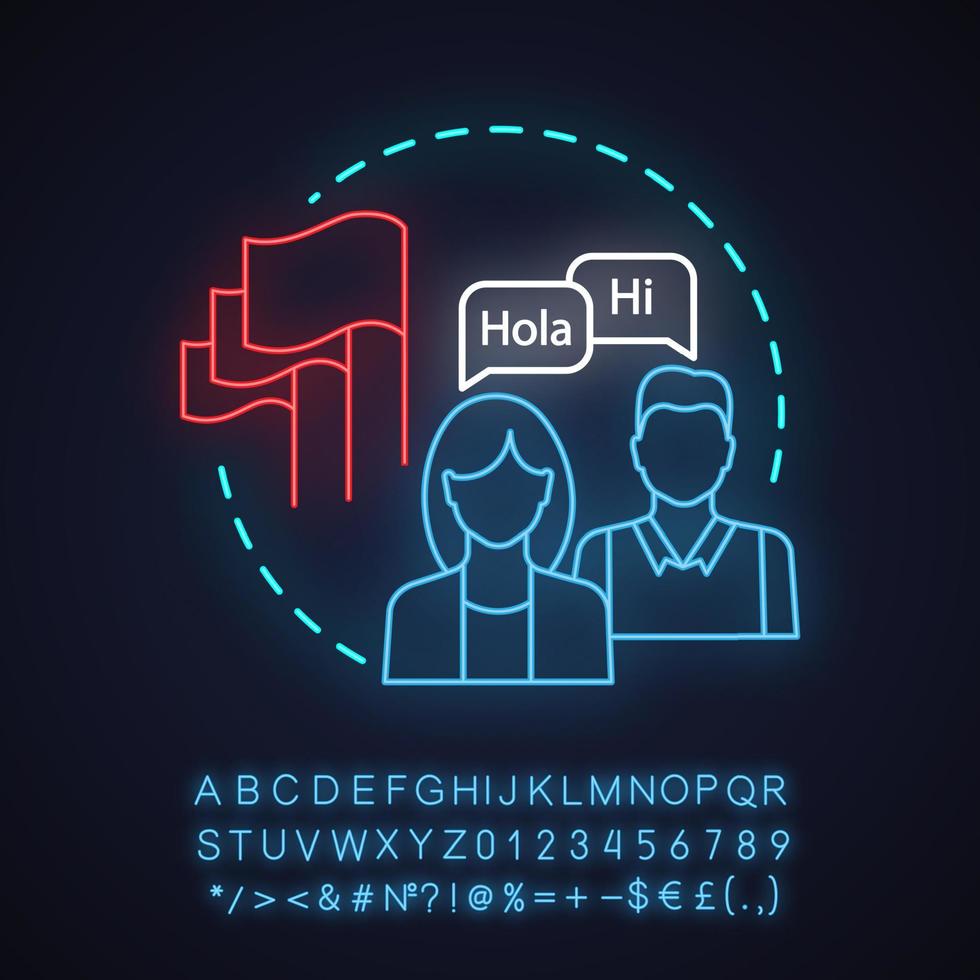 Practice with native speaker neon light concept icon. Interpretation. Lessons with tutor. Foreign language learning idea. Glowing sign with alphabet, numbers and symbols. Vector isolated illustration Pro Vector