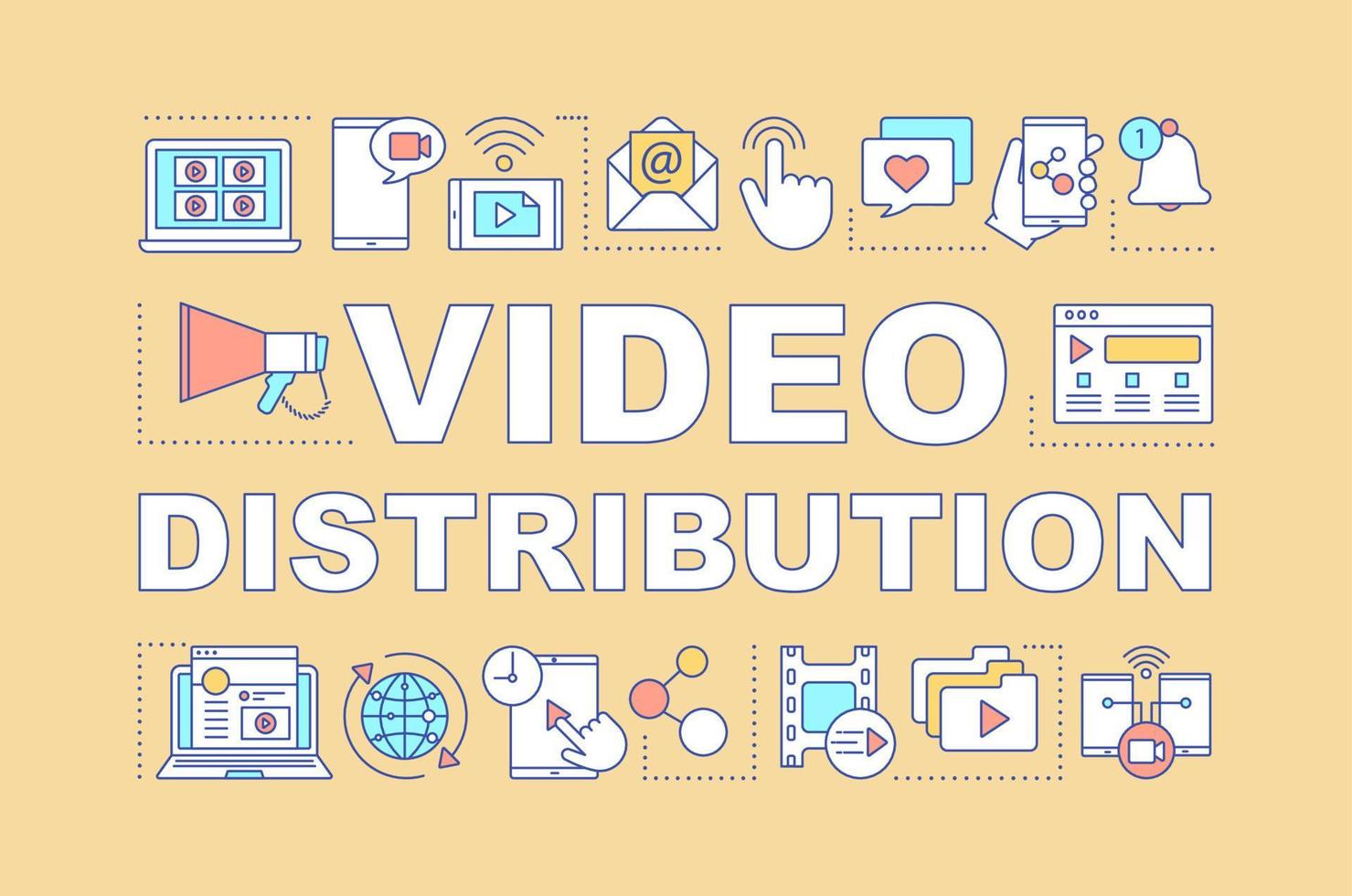 Video distribution word concepts banner. Streaming, hosting service. Video sharing platform. Presentation, website. Isolated lettering typography idea with linear icons. Vector outline illustration Pro Vector