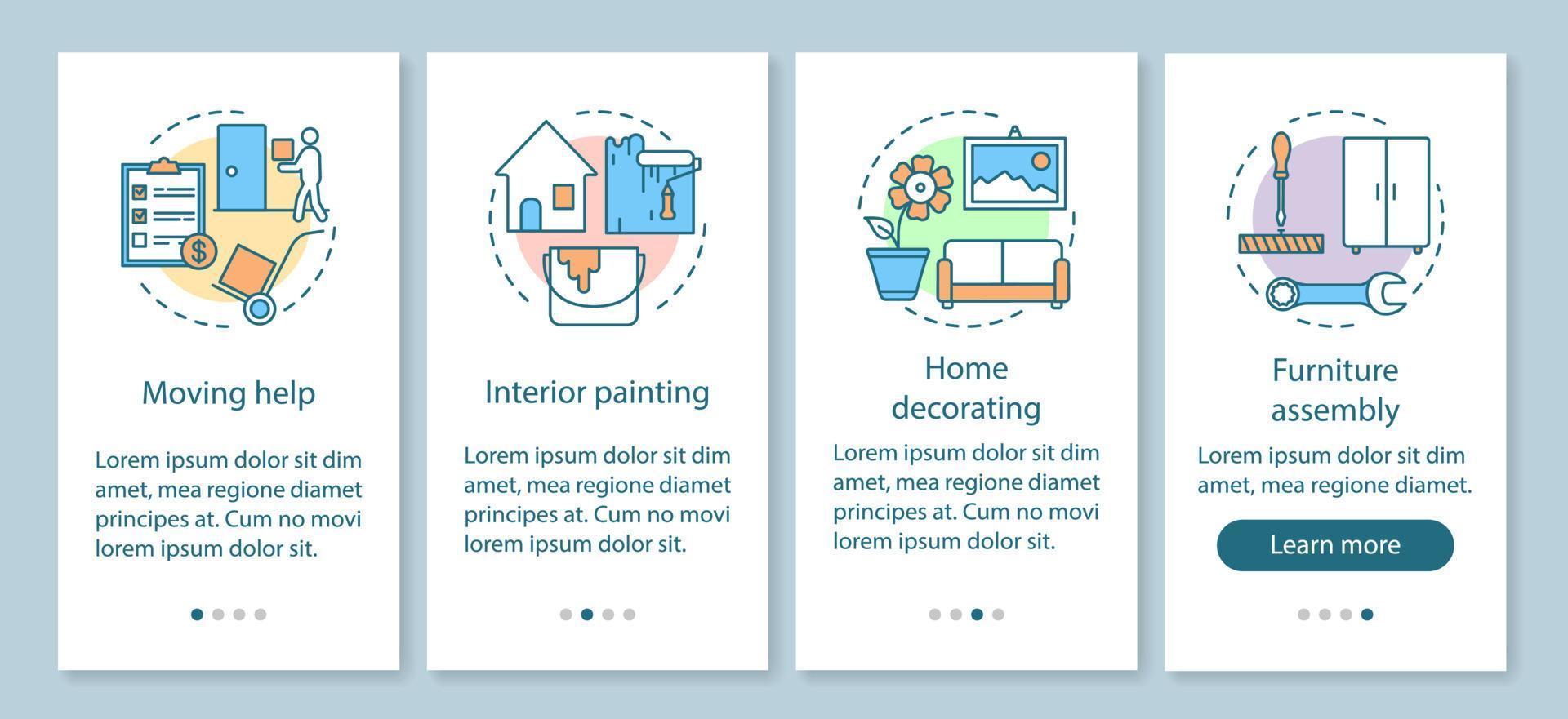 Home services onboarding mobile app page screen with linear concepts. Interior painting. Home decorating. Four walkthrough steps graphic instructions. UX, UI, GUI vector template with illustrations Pro Vector