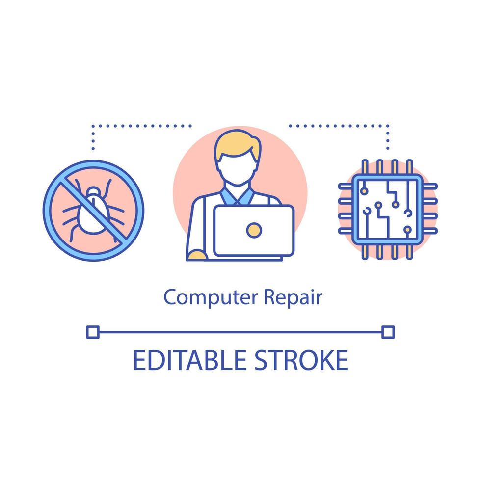 Computer repair concept icon. PC technician service. Laptop fix, setup. Software installation. Tester at work. Debugging idea thin line illustration. Vector isolated outline drawing. Editable stroke Pro Vector
