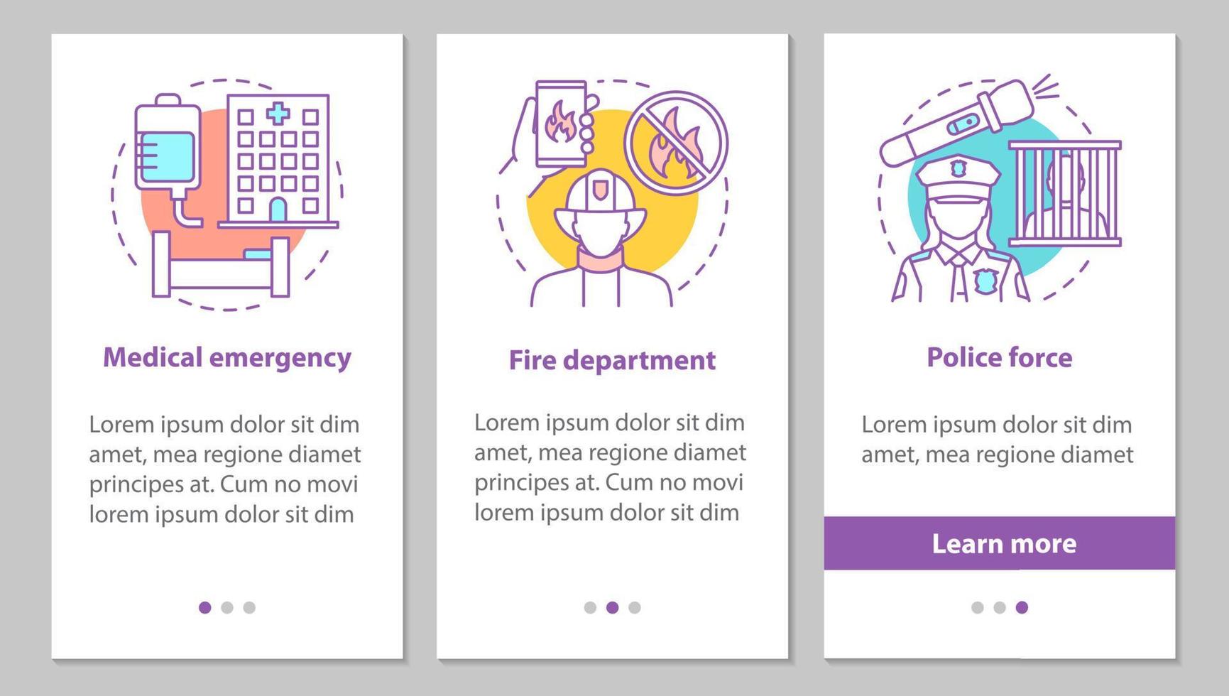 Public services onboarding mobile app page screen with concepts. Police force, firefighter department, medical emergency steps graphic instructions. UX, UI, GUI vector template with illustrations Pro Vector