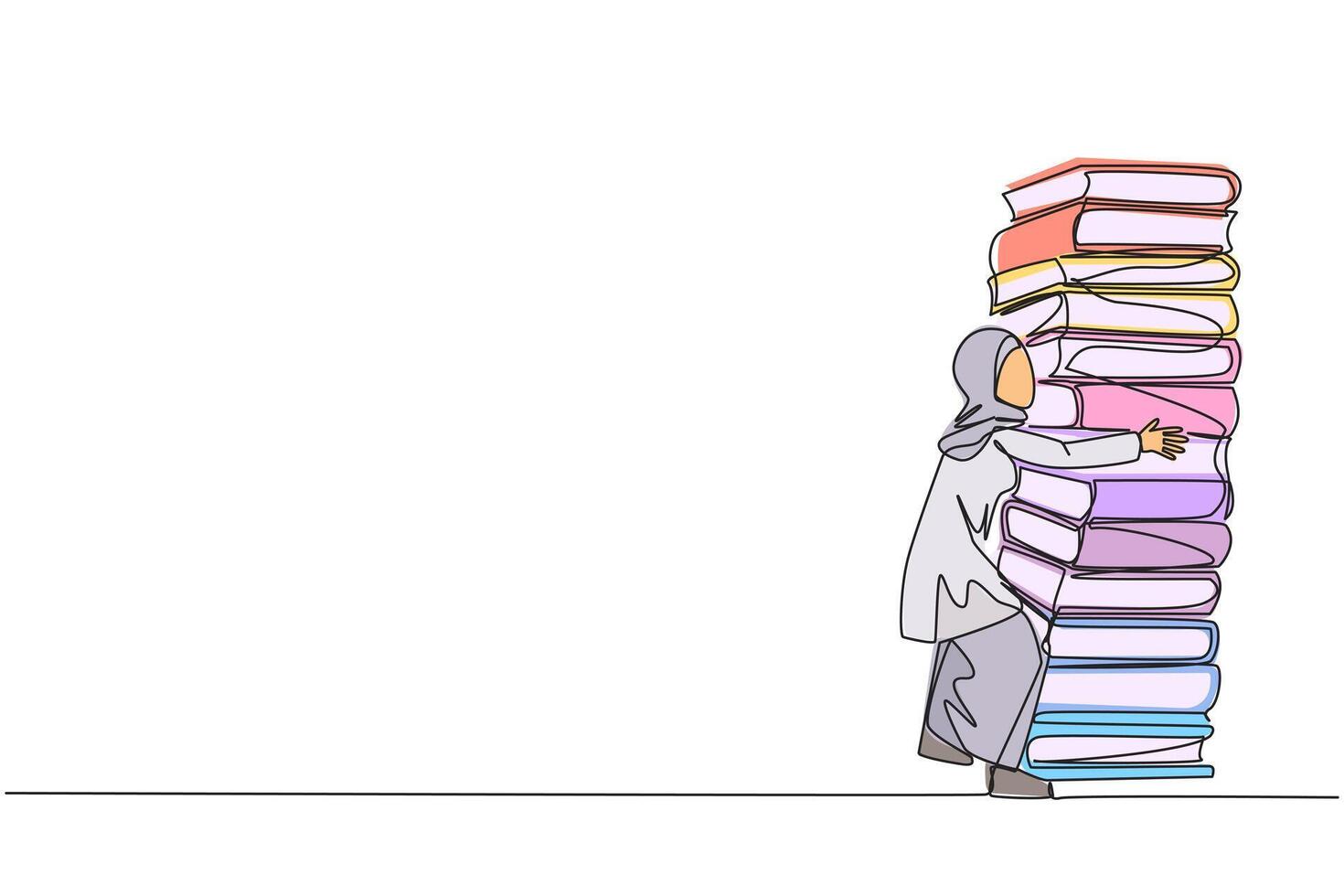 Continuous one line drawing Arab woman hugging very high pile of books. Hobby to collecting and reading books. Filling free time with useful things. Read. Single line draw design illustration Pro Vector
